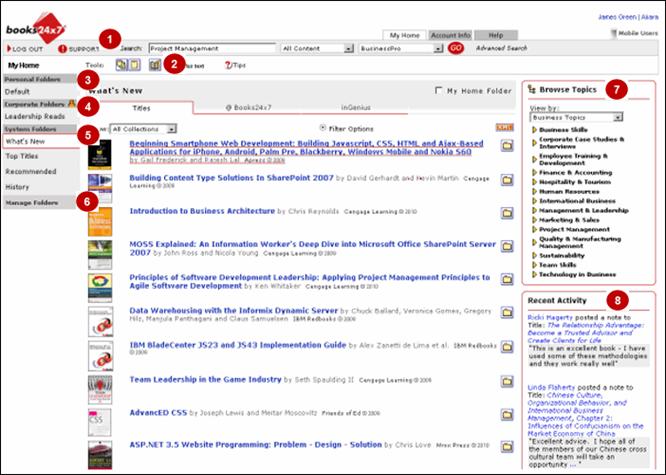 - System Folders: Sistemske mape (folder) u kojima možete pronaći nove naslove, nadolazeće događaje, Books24x7 info, najpopularnije naslove ili vlastitu povijest korištenja.