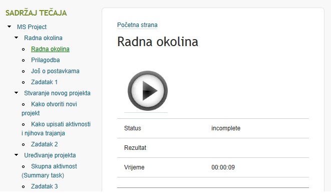 Klikom na Izlaz iz lekcije prikazuje se početna stranica tečaja s popisom svih pripadajućih lekcija i ostvarenom statistikom korištenja.