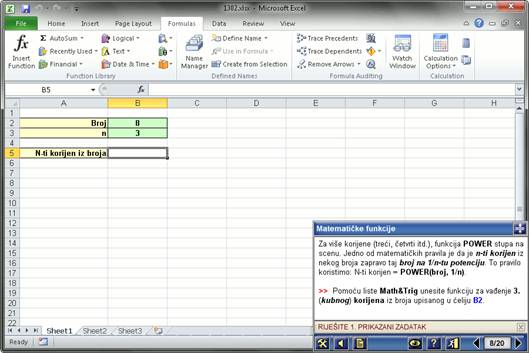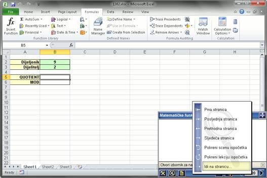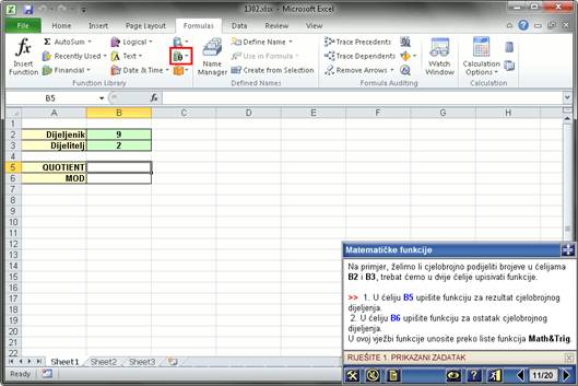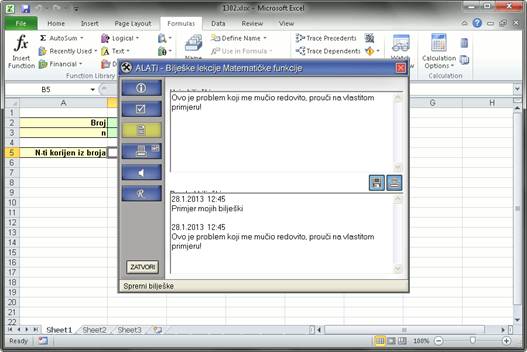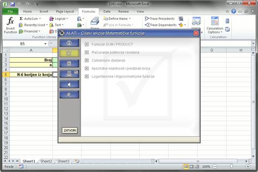 Osim multimedijalnog dijela, svaka lekcija uključuje primjere i zadatke. Radi se o Excelovim tablicama koje možete preuzeti na vlastito računalo. Preporučujemo da primjere i zadatke preuzmete nakon što savladate multimedijalni dio lekcije. Nakon preuzimanja, primjere i zadatke otvorite u Excelu. Primjeri su obično identični onima koji su korišteni u sklopu multimedijalnog dijela, a zadatke je potrebno riješiti i rješenje poslati nazad klikom na gumb Dodaj svoj zadatak.